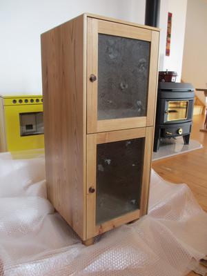 昔、子供の頃、合板のカラーボックスが出まわる前の頃、こんな感じの食器棚とかが茶の間に置いてあったりしませんでしたか?引き戸で時々締まりが悪くなったり、扉を開けると木の香りがしたり・・・