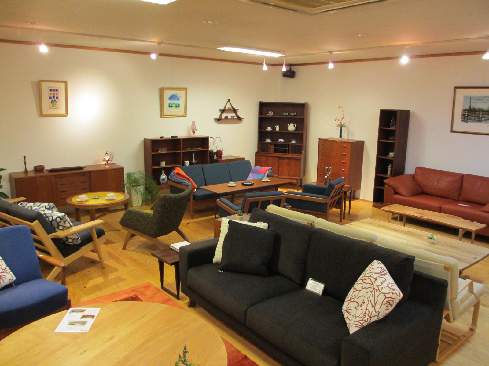 1Fには、ニレのダイニングテーブル、二人掛けソファ、丸テーブル、3段飾り棚などがあり、